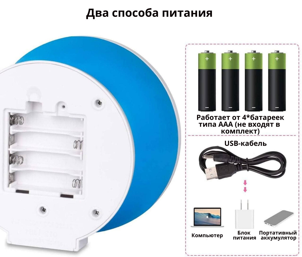 Питание: USB-кабель или 4 батарейки ААА (в комплект не входят).